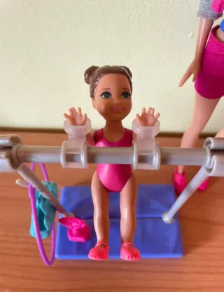 Set de Barbie gimnasta y entrenadora artística con accesorios. - Incluye una muñeca Barbie entrenadora. - Incluye una muñeca bebé gimnasta. - Accesorios de gimnasia como barra, aro y vestuario.