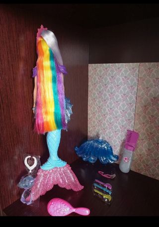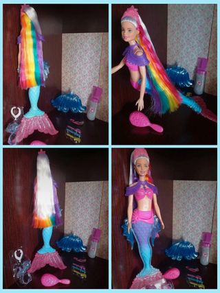 Muñeca nueva, customizada con cuerpo de Barbie Sirena y cabeza de Barbie destellos de arcoiris con varios accesorios para utilizar con su pelo con un peine que mientras la peinas llenas de brillantina su pelo. También hay 2 gomas de colores y horquillas de colores para el pelo. Más accesorios como dos colas de sirena intercambiables, una rosa y otra azul, una mascota que es una tortuga de mar, un colgante blanco y 2 tiaras preciosas, la tiara rosa tiene brillantina. Además de un cepillo rosa de Barbie. Todo es nuevo completamente sin uso, peine con deposito de brillantina precintado sin usar y todo en perfecto estado.