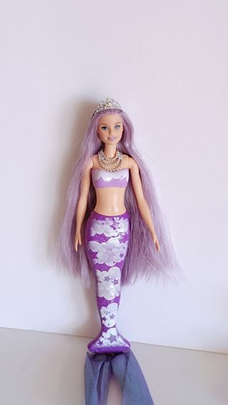 Muñeca Barbie con cola de sirena en tonos morados y rosas. Incluye accesorios. - Cola de sirena con escamas moradas y detalles brillantes. - Parte superior de bikini morada con adornos. - Collar y pendientes a juego. - Lazo rosa en el pelo.