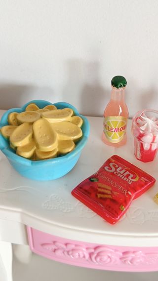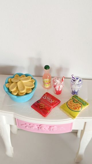 Set de miniaturas de comida para muñecas Barbie. Incluye varios accesorios para crear escenas divertidas. - Bol con patatas fritas. - Botella de refresco de limón. - Dos vasos de batido con pajita. - Paquetes de snacks. - Diseño detallado y colorido.