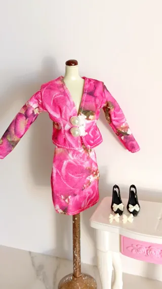 Conjunto de traje de chaqueta y falda para muñeca Barbie con estampado floral. - Chaqueta con estampado de rosas fucsias y detalles. - Falda a juego. -zapatos y pendientes
