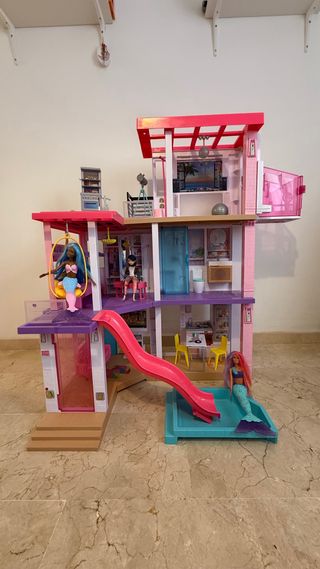 Casa de muñecas Barbie Dreamhouse en excelente estado, casi nueva. Ideal para horas de juego y diversión. Modelo noche y dia, con luz y sonido para ambientar con música o hacer más realista el juego (sonidos de horno, baño...) - Incluye tobogán rosa. - Piscina azul. - Múltiples niveles y habitaciones. - Accesorios de cocina y baño. - Muñecas incluidas.