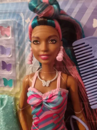 Muñeca Barbie Totally Hair con cabello largo y colorido. - Incluye accesorios para el cabello. - Vestido a rayas. - Bolsa pequeña. Está sin usar