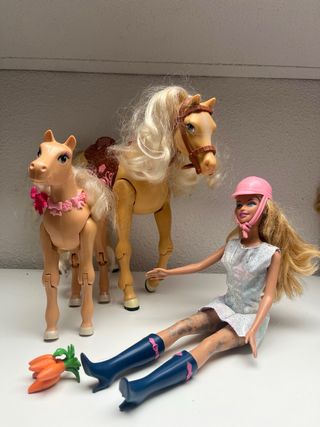 Preciosa muñeca Barbie amazona con su caballo, ideal para niñas a las que les gusten los caballos. El caballo funciona con pilas. Incluye también algunos accesorios. La muñeca y el caballo están en buen estado, listos para jugar. - Muñeca Barbie amazona. - Caballo a pilas. - Accesorios incluidos.Mueve las patas de delante si le echas la cabeza para atrás y si le tiras de la cola mueve las patas de detrás y relincha y entre las orejas tiene un botón que también relincha.
