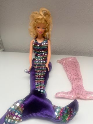 Muñeca Barbie sirena con un vestido morado y cola brillante. Incluye un micrófono plateado. - Vestido con lentejuelas multicolores. - Cola de sirena de terciopelo morado. - Adornos brillantes en la cola.