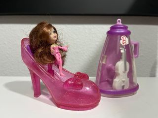 Set de juego de Mini Barbie con un zapato rosa brillante y un violonchelo . - Muñeca Mini Barbie. - Zapato de plástico rosa con lazo. - Violonchelo mini.