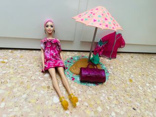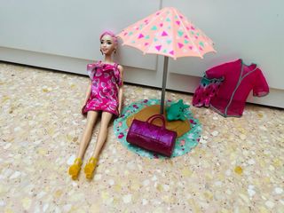 Muñeca Barbie Color Reveal con accesorios. - Incluye muñeca. - Accesorios de playa. - Vestido con estampado de sandías. - Zapatos amarillos. - Bolso brillante. - Paraguas de playa.