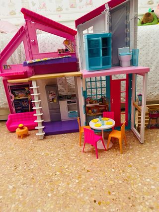 Casa de muñecas Barbie Malibu. - Diseño de tres plantas. - Incluye accesorios de cocina y baño. - Muebles como sofá, cama y mesa con sillas.