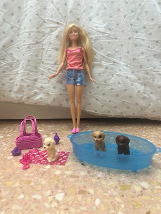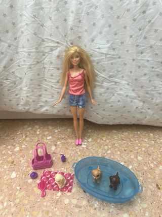 Set de Barbie con accesorios para el cuidado de mascotas. Incluye una muñeca Barbie, tres cachorros y varios complementos. - Muñeca Barbie con top rosa y shorts vaqueros. - Tres cachorros de diferentes colores. - Tina de baño azul. - Bolso rosa. - Cepillo y accesorios de aseo.