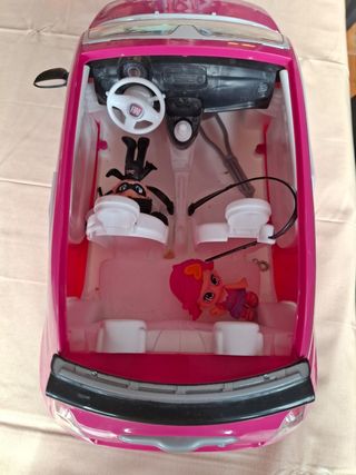 Precioso coche de juguete de Barbie, con diseño Fiat 500. Es de color rosa y tiene detalles en blanco. Incluye dos muñecas pequeñas. Perfecto para jugar. - Diseño Fiat 500 - Color rosa y blanco - Incluye dos muñecas