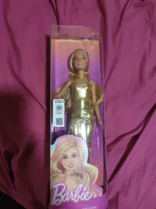 Muñeca Barbie con un diseño vibrante y moderno. - Incluye un conjunto de top naranja y pantalón estampado. - Accesorios dorados. - Presentada en su embalaje original.