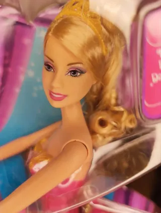 Muñeca Barbie Twinkle Toes, también conocida como Barbie Bailarina Estrella o Barbie Ballet. Totalmente nueva, sin sacar de la caja. Tiene el peine suelto. Es una muñeca Barbie temática de ballet, vestida con una tiara dorada y un tutú brillante. Al presionar un botón en su costado, sus piernas y brazos se mueven para realizar poses de bailarina. El número de SKU de este modelo es N5791.