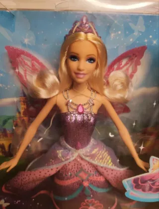 Muñeca Barbie Catania con alas de hada, inspirada en el mundo de fantasía. Incluye un DVD. - Vestido brillante en tonos morados y rosas. - Corona y collar a juego. - Alas translúcidas con detalles brillantes. - Incluye DVD de Barbie Mariposa y la Princesa de las Hadas (2013). Caja un poco dañada, ver fotos. Nunca sacada de la caja.