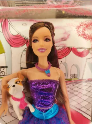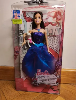 Muñeca Barbie Marie-Alecia de la película A Fashion Fairytale. - Incluye un perrito y accesorios. - Vestido azul brillante. - Edición de 2010. Totalmente nueva, sin sacar de la caja. Tiene las gafas sueltas.