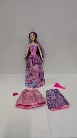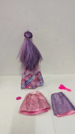 Muñeca Barbie estilo princesa con cabello morado y vestido brillante. - Envíos por IMPOST - Incluye dos vestidos adicionales. - Viene con un cepillo para el cabello. - Accesorios de moda para la muñeca.