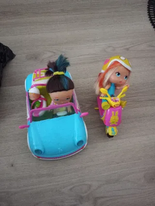 Set de coche y moto de las Barriguitas. - Coche de color azul con detalles rosas y blancos. - Moto de color rosa con detalles amarillos y un dibujo de conejo. Incluye dos muñecas barriguitas y un bebé con la silla de montar en el coche.