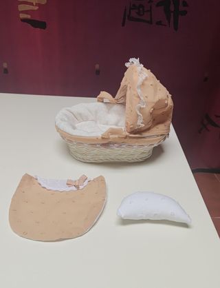NUEVO! (no incluye muñeca) Capazo/moisés de mimbre para muñecas, un accesorio imprescindible para los coleccionistas de Barriguitas de Famosa o para regalar. Capazo de imitación mimbre con asas y capota abatible. Tela plumeti en tono melocotón/beige con delicados encajes blancos. Incluye capota, edredón y almohada a juego. Réplica moderna, parte de las reediciones de Famosa que imitan el diseño vintage de los años 70-80.