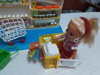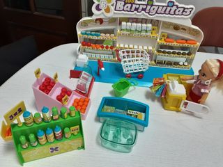 Supermercado Barriguitas para niños y niñas. Incluye TODOS los accesorios de la foto (comida, caja registradora, carnicería, etc.) y también la muñeca.