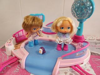 Pista de patinaje sobre hielo de Barriguitas con 2 muñecas incluidas y un pingüino. La bola de luces de fiesta funciona con pilas no incluidas.