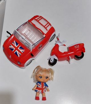Coche descapotable, moto tipo vespa y muñeca Barriguitas