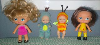 Lote de cuatro muñecas Barriguitas. - Muñecas con pelo rubio. - Ropa de diferentes colores y estampados. - Incluye sombreros y botas.