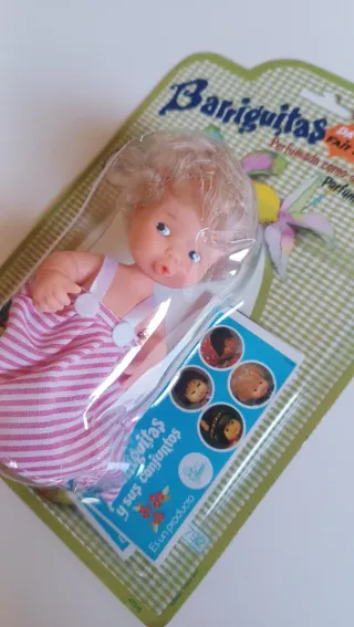 Muñeca clásica de la marca Barriguitas, fabricada en los años 80. Un juguete nostálgico. Nuevo a estrenar. - Incluye cuna y accesorios. - Muñeca con ropa original.