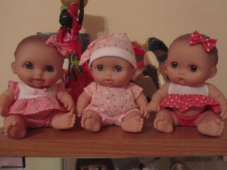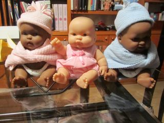 Conjunto de tres muñecas. - Muñeca con pelo azul y vestido estampado.Antonio Juan - Muñeco de bebé.Berenguer - Muñeca pequeña con vestido de punto rosa y blanco. 200 artículos en mi perfil a buen precio.