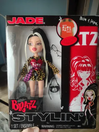 Muñeca Bratz Stylin' Jade, edición Passion 4 Fashion. Incluye accesorios de la muñeca como gafas, capillo del pelo y bolso. Viene con una camiseta oversized de Bratz Dolls totalmente personalizable La caja muestra el diseño de la muñeca y arte promocional. Se puede hacer entrega en mano en Alicante ciudad por 40€.