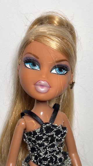 Muñeca Bratz con el pelo rubio y un elegante vestido negro con detalles plateados. - Ojos azules grandes y maquillaje característico. - Pendiente en forma de cruz en una oreja. - Vestido con tirantes negros y textura brillante.