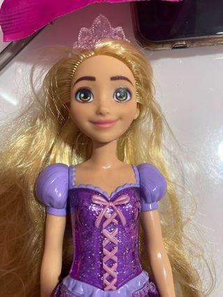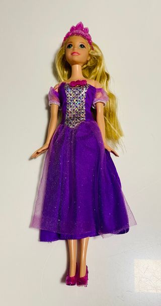 Muñeca de Rapunzel, la princesa de Disney, con su característico vestido morado. Tiene los pies un poco mal pero lleva tacones. - Vestido brillante con detalles. - Corona. - Pelo largo rubio.