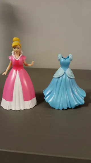Muñeca de la princesa Cenicienta y muñeco del príncipe de Disney, con dos ratoncitos, una tela de la Cenicienta, y un segundo traje para el príncipe (traje que era del príncipe de Blancanieves). El traje de la Cenicienta está algo pintado en la parte de detrás, los tacones también están algo estropeados.