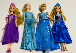 Muñecas inspiradas en princesas de Disney (Rapunzel, Cenicienta, Elsa y Ana de Frozen). Rapunzel tiene el vestido descosido (ver foto) Cada muñeca 10€ - Muñeca con vestido morado y tiara. - Muñeca con vestido azul claro brillante. - Muñeca con vestido azul con estrellas plateadas. - Muñeca con vestido azul royal y tiara.
