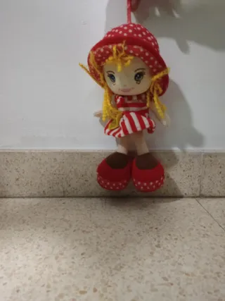 Adorable muñeca de trapo con un diseño encantador. - Vestido a rayas rojas y blancas. - Gorro a juego con lunares blancos. - Pelo rubio rizado. - Bolas rojas en los pies con lunares blancos.