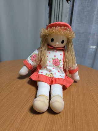 Preciosa muñeca de trapo vintage, ideal para coleccionistas. Se encuentra en buen estado, lista para un nuevo hogar. - Muñeca de tela con vestido estampado. - Sombrero de paja. - Pelo castaño recogido en trenzas.
