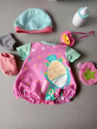 Bonito juego para bebé Nenuco, compuesto por: 1. Bonito mandilón para muñecas. Es antiguo de los muñecos Nenuco. Es de color blanco con rosa y amarillo, en la parte delantera tiene un bolsillo con la imagen de un conejo. Tiene velcro en la parte Tiene una mancha en la parte delantera como se aprecia en las 2 últimas fotos . 3. Botes pequeños. No Nenuco. Muñeco Nenuco (No incluido) Medidas: Largo: 14,5 cm Ancho de hombro: 18 cm 2. Molde de repostería de los muñecos Nenuco, en excelentes condiciones, es de plástico de color marrón. Medidas: Largo: 15 cm Ancho: 6,5 cm cerrado y 12,5 abierto
