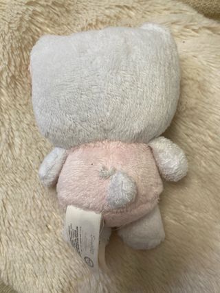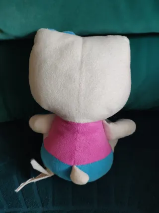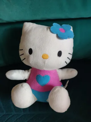 Adorable peluche de Hello Kitty con un vestido bicolor (rosa con corazón azul) y flor azul en la cabeza. Suave y blandito. Tags: Nino, ninot, peluix, muñeco, muñeca, nina, gato, gata, coleccionismo, colección, kity