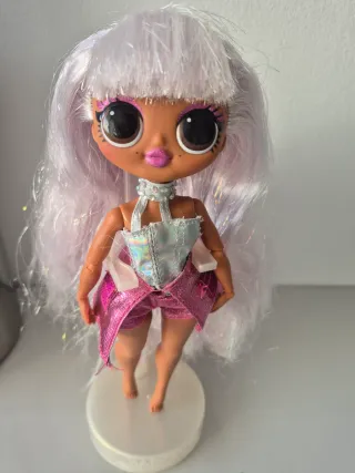 Muñeca LOL Surprise OMG con cabello largo y plateado y atuendo brillante. - Vestido plateado con detalles holográficos. - Falda rosa metálica. - Collar con pedrería.