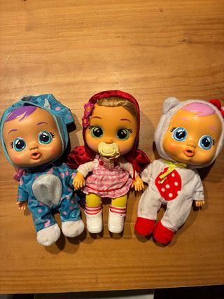 Conjunto de tres muñecas Bebé Llorón. - Muñeca con traje azul de lunares y capucha de orejas. - Muñeca con traje de Caperucita Roja. - Muñeca con traje blanco de fresa y capucha de oso, Hello Kitty
