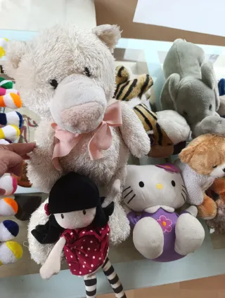 Conjunto de peluches de diferentes tamaños y personajes. - Incluye un gusano multicolor. - Peluche de gatito blanco con lazo rosa. - Muñeca con vestido de lunares. - Peluche de tigre. - Peluche de Hello Kitty. - Peluche de oso. - Peluche de ardilla. - Peluche de búho. - Peluche de conejo. - Peluche de perro con manchas. - Peluche de niña con gorro rojo.