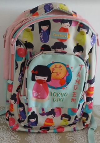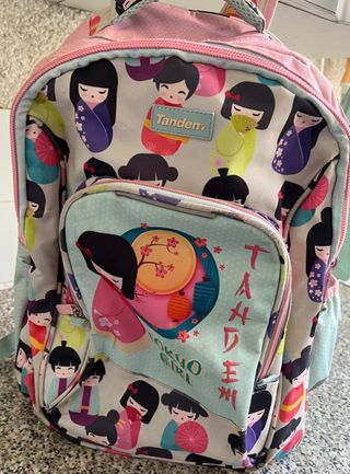Mochila escolar Tandem Tokyo Girl, ideal para el colegio. Es bonita y colorida. - Diseño con estampados de muñecas japonesas. - Compartimento principal con cierre. - Bolsillo frontal con cierre. - Correas ajustables.