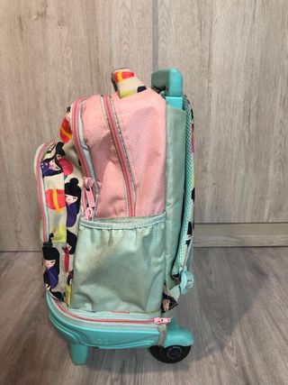 Mochila infantil con diseño estampado en tonos pastel y frontal con serigrafía de muñecas japonesas. Se puede incorporar a un carro. Tiene varios compartimentos, 2 de ellos de gran capacidad. Puede usarse con o sin carro. Tiene tirantes ergonómicos de espuma extra transpirable. Se lava fácilmente.