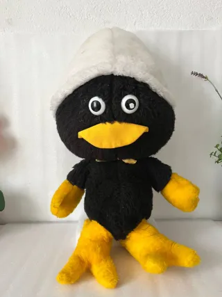 Peluche Calimero, personaje popular que se originó en Italia y más tarde fue adaptado a una serie de anime japonesa en la década de 1970. Diseño: El muñeco de peluche se identifica por su cuerpo negro, alas y patas amarillas, ojos grandes y la distintiva cáscara de huevo blanca en su cabeza. • Ideal para Coleccionistas •