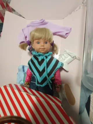 Muñeca Mariquita Pérez en perfecto estado, conservada en su caja original. - Incluye ropa adicional. - Caja con diseño de rayas rojas y blancas.