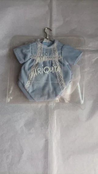 Conjunto de ropa para muñeco 21 cm Mini Juanin Mariquita Pérez. Es un una pieza en color azul claro con detalles de encaje blanco,fabricado en organdí. - Detalle de encaje en el cuello y los laterales.Formado por pelele y capota. - Incluye perchas. - Nuevo