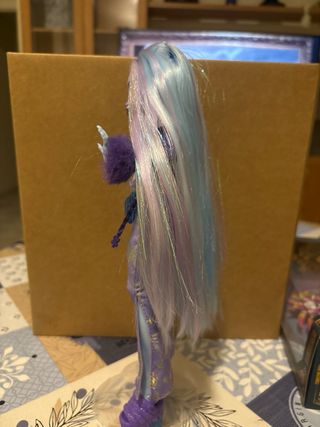Muñeca Spectra Vondergeist de Monster High, con su característico estilo etéreo. - Pelo largo y morado. - Atuendo morado brillante con detalles plateados. - Accesorios como diadema y pendientes. - Transparencias en la falda y mangas.