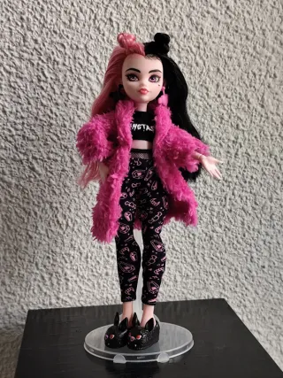 Muñeca de la colección Monster High, personaje Draculaura. Viene en su empaque original. - Incluye accesorios como bolso, vestido y zapatos. - Cabello largo y rosa con mechones negros. - Diseño inspirado en el personaje de Draculaura.
