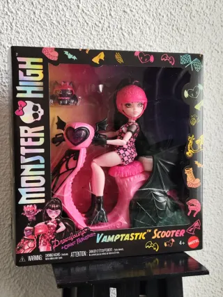 Set de Monster High g3 con la muñeca Draculaura y su Vamptastic Scooter, nuevo en caja. - Muñeca Draculaura con casco rosa, guantes negros y gafas. - Scooter rosa con detalles de murciélago. - Incluye figura de mascota Count Fabulous, también con casco, para llevar en la cesta. ---+ Barbie mattel curvy Dracula vampiro vampiresa figura articulada moto motorino bambola fantastic