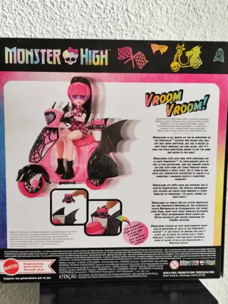 Muñeca Monster High Draculaura con su moto. - Moto de color rosa con detalles negros. - Alas de murciélago decorativas en la moto. - Muñeca con pelo rosa y negro. - Vestido rosa y botas a juego.
