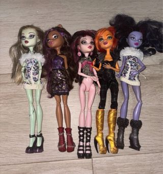 Conjunto de cinco muñecas Monster High. Son muñecas que lo han dado todo (yo misma las he comprado de 2 mano para recambios); algunas tienen defectos (están en las imagenes). Draculaura tiene el cuello pegado con super glue y algunos mechones del lado izquierdo cortados.