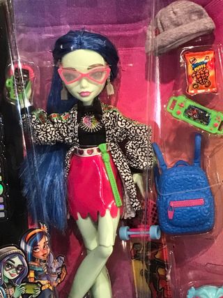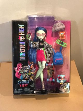 Muñeca Monster High Ghoulia Yelps, completamente nueva y en su empaque original. - Incluye accesorios como mochila, videojuego portátil y gorra. - La muñeca tiene cabello azul y viste un atuendo a la moda.